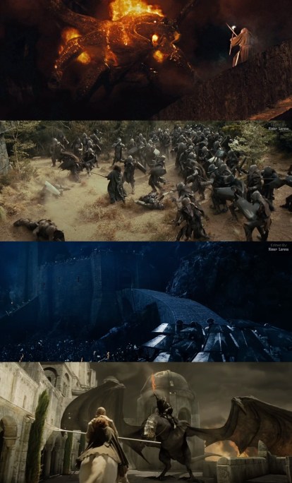 Top to bottom: (1) Gandalf the Grey confronts the Balrog of Moria, (2) Aragorn makes a stand against a host of Uruk-Hai, (3) more Uruks lay siege to Helm’s Deep, and (4) Gandalf the White is stared down by the Witch King of Angmar.