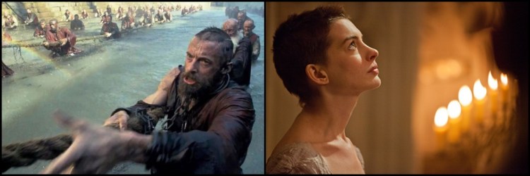 Left: Look down! Look down! You’ll always be a slave! Look down! Look down! You’re standing in you’re grave… Right: Hathaway’s role in Les Mis is minimal, but for its part, it is plenty depressing.