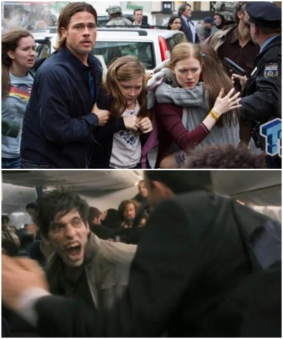 Top: Boring… all these characters are boring. Even Mr. Brad Pitt has little to no charisma throughout the entire freaking movie. Bottom: Get ready for some of the least threatening, least intimidating, least scary zombies ever, with zero bloodshed and gore.