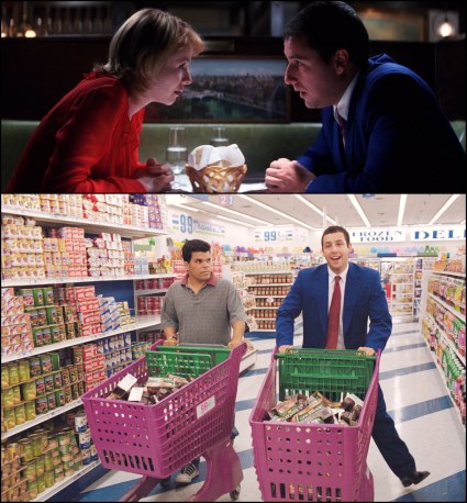 Top: Adam Sandler (right) and Emily Watson (left) star as the oddest romantic couple in years. Bottom: Sandler is going places with pudding.