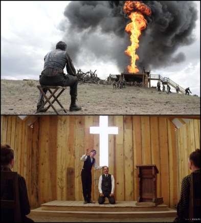 Top: The blood of the land… Bottom: Eli Sunday (Paul Dano, center left) enjoys a rare moment of power over Daniel Plainview (Daniel Day-Lewis, center right). It is a moment the oil baron doesn’t forget.