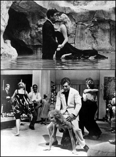 Top: Marcelo Mastroianni (left) attempts to romance Swedish actress Anita Ekberg (right). Bottom: Mastroianni engages in further drunken antics later in the film. The whole movie is like this, mind you.