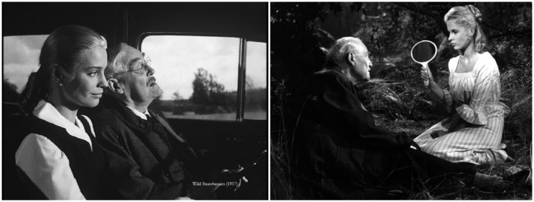 Left: Ingrid Thulin (left) and Victor Sjostrom (right). They’re all good friends in the end. Right: Sjostrom experiences some trippy stuff in Strawberries, using narrative and cinematographic techniques that Woody Allen’s famous Annie Hall (1977) would later replicate.