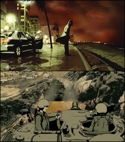 Top: An aged Israeli soul looks out upon the Mediterranean Sea early in the film. The night is dark and full of even darker memories. Bottom: Israeli soldiers small-talk while their tanks rumble through Lebanon.