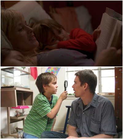 Top: Patricia Arquette (center left) stars as a struggling Supermom in this long tale of a boy’s coming-of-age. Too bad the story couldn’t have been about her. Bottom: Ethan Hawke (right) gives it his all as one of the few divorced Dads who isn’t caricatured in popular film.