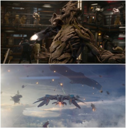 Top: Groot (Not-Vin Diesel) unleashes the beast. Bottom: Pretty, pretty visuals as the Guardians take on Ronan the Snoozer (Lee Pace) in his Twizzler-shaped mothership.
