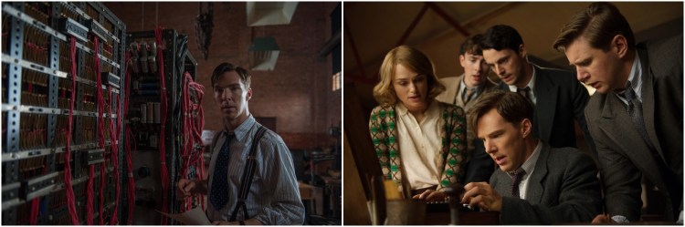 Left: Benedict Cumberbatch builds his master-machine in hopes of decoding the infamous Nazi enigma encryption. Right: Cumberbatch (bottom center), Keira Knightley (right), Matthew Goode (top center) show those Nazis who’s boss.