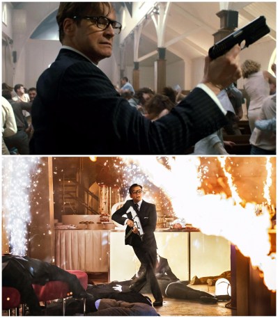 Top: Get ready for one hell of an awesome action scene with insane handheld camerawork. Take that, Skyfall (2012)! Bottom: Edgerton takes charge in Kingsman’s ludicrous, ridiculous finale.