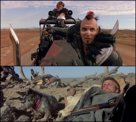Top: Vernon Wells (right) prepares to assault Mel Gibson’s caravan. Bottom: Gibson (foreground, right) chills with his loyal dog-companion amidst all the dreary post-apocalyptica.
