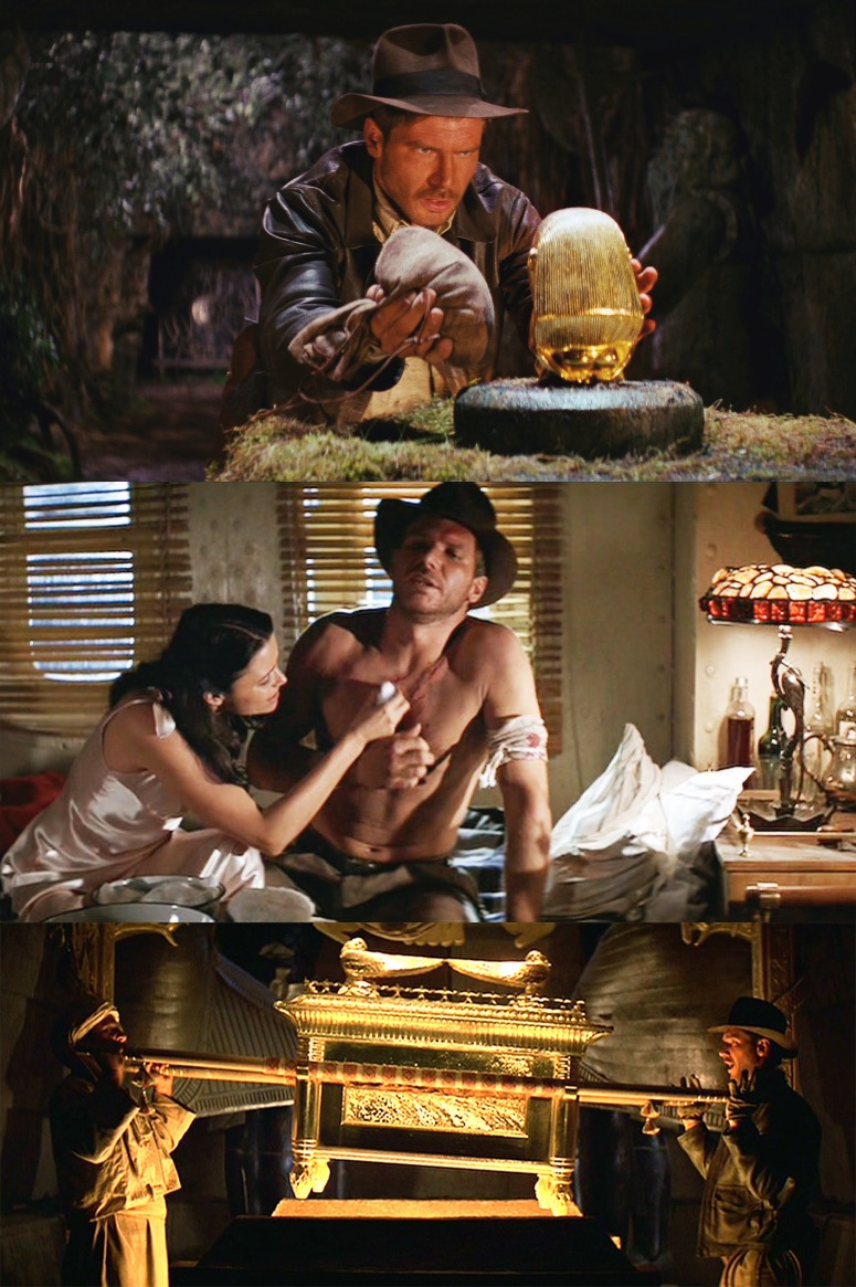 Top to Bottom: (1) Indy prepares to retrieve a golden idol in the mountains of Peru, (2) Marion tries to mend Indy’s wounds much to his dismay, and (3) shebam(!) they retrieve the lost Ark of the Covenant!