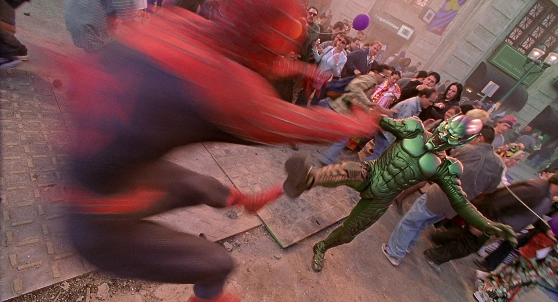 Rounding out SM’s stellar features are solid action-scenes depicting rather subdued and refreshingly low-key violence. By low-key I don’t mean boring or unimpressive, but grounded and well shot. Though a Spider-Man movie necessitates certain special FX and CGI characters, Raimi directs around them with his veteran touch; he keeps the digital web-slinging at long or medium shots in faded or low lighting, and frequently switches to stunt doubles and real actors during close-ups and most of the close-quarters combat. Great blockbusters are able to take epic stakes and big action and keep them realistic and relatable, so the audience can project themselves onto the screen. SM does that in spades, so much so that its final battle consists of a fistfight between Goblin and Spidey in an abandoned warehouse. It’s effective, actually violent action that doesn’t rely on bombastic, bloated set-pieces that go on for 45 minutes and feature ludicrous, cartoony choreography.