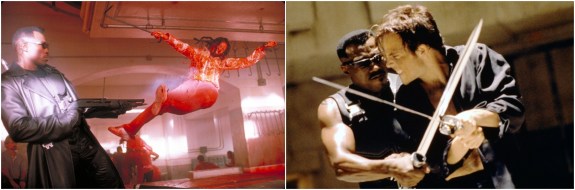 Left: Blade introduces himself at a vampire night-raver. Right: Wesley Snipes (left) faces Stephen Dorff (right) in the film’s bizarre final showdown.