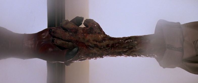 Much of PoD’s dark charm stems from Carpenter’s great music (a regular asset in his filmography, if you haven’t noticed) and the narrative’s incredible patience. Over an hour of the film’s 101-minute running time is dedicated to establishing the antagonists’ history and origin, as well as slowly eliminating several red-shirts until the remaining survivors finally realize the jig is up. This tactic works surprisingly well given the effective scares in the movie’s final half hour and how well the story is paced. Many of the special effects are limited by the film’s chump budget, but Carpenter films them with restraint and manages to paint some hauntingly beautiful visuals nonetheless, such as the swirling canister of titular evil and teasing shots of Satan’s anti-matter universe.
