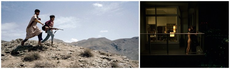Left: Said Tarchani (left) and Boubker Ait El Caid (right) patrol the Moroccan hills with their new weapon. Right: Koji Yakusho (right) embraces his naked, heartbroken daughter, Rinko Kikuchi (left) during the film’s final shot.