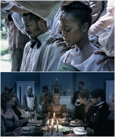 Top: Nate Parker (left) is wed to Aja Naomi King (right). Bottom: Nat Turner happens to be owned by an ailing Southern aristocracy, desperate to retain their decaying family legacy.