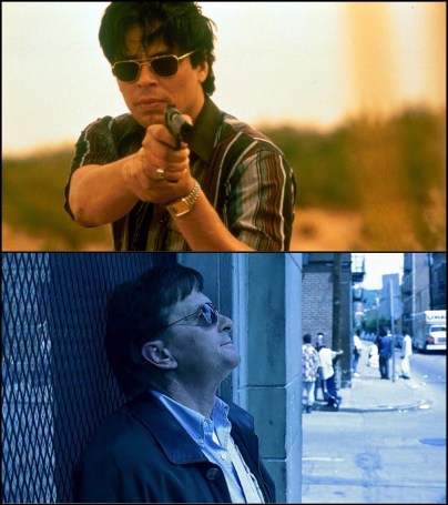 Traffic features Benicio del Toro (top) as a hard-boiled Mexican cop and Michael Douglas (bottom) as a rising drug enforcement politician. Note the distinct color grading shades for each subplot.