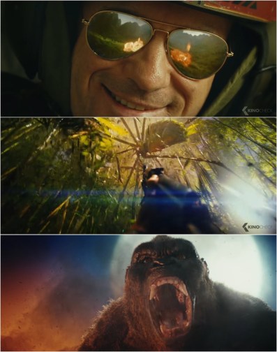 Kong: Skull Island gets up close and personal with an explosion of colors. From top to bottom: Symbolism erupts on aviator sunglasses as our principal cast explore the titular setting, Shea Whigham blasts a giant spider with his AK-47 in a memorable 1st-person shot, and Kong roars a challenge to his human antagonists.