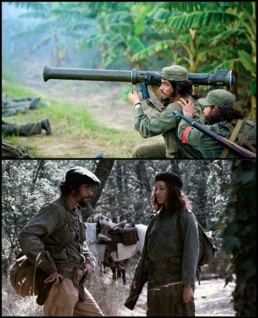 Top: Che (del Toro) fires an RPG while assisted by Raul Castro (Rodrigo Santoro). Bottom: Che chastises Tania Bunke (Franka Potente) for exposing her undercover operation in Bolivia.