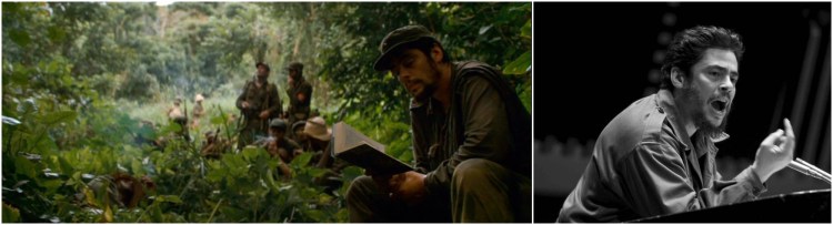 Left: Always the intellectual, Ernesto “Che” Guevara (Benicio del Toro, foreground, far right) reads a novel while his squad take brief respite from overthrowing the Cuban government. Right: Che addresses the United Nations in his classical spitfire tone.
