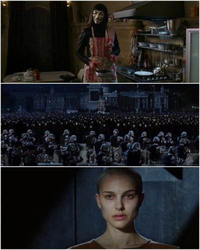 Top: Hugo Weaving wears a costume that perfectly sums up the problem with his character. Middle: Citizens of London assemble during the film’s final act, all dressed in Guy Fawkes-masks. Bottom: Natalie Portman stares at nothing in her terrible haircut.