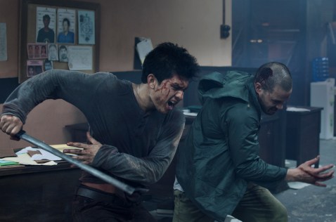 Iko Uwais (left) wields a paper-cutter against assailant and former Raid 2 costar, Zack Lee (right).