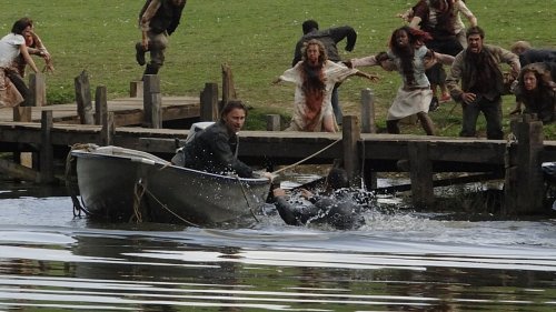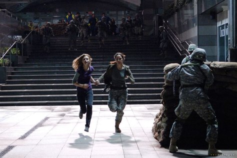 Rose Byrne (center right) and Imogen Poots (center left) race from a mixed crowd of civilians and rabid infected.