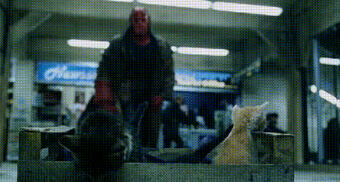 Uh-uh, second date, no tongue! Hellboy defends a crate of defenseless kittens against Sammael, The Hell Hound.