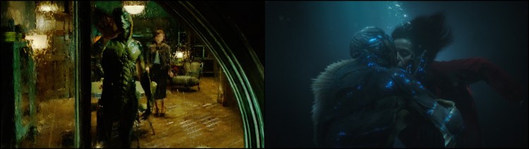 Rounding out The Shape of Water’s idiosyncratic strengths are its use of color and music. Much of the film’s soundtrack consists of diegetic period song and dance, of which Hawkins’ protagonist and Jenkins’ supporting character are both fans. Brief scenes of them practicing musical routines culminate in an ambitious, memorable dream sequence where Hawkins imagines herself on stage with the Amphibian Man. Del Toro’s cool, dark color tones give way to high-key lighting in black-and-white cinematography, a celebration of non-traditional romance whereby Hawkins and Jones, the latter in full creature FX and makeup, dance — and in Hawkins’ case, also sing — their troubles away.