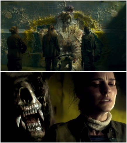 Top: Members of a scientific research team exploring the Shimmer, a mysterious paranormal region in northern Florida, examine the twisted remains of a previous military expedition. Bottom: Natalie Portman tries not to engage with a mutated bear.