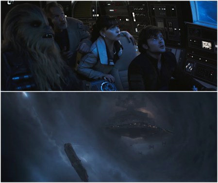 Top: Ehrenreich (far right), Clarke (center right), Harrelson (center left), and Suotamo (far left) tense up as they pilot the Millennium Falcon through the fabled Kessel Run. Bottom: One of the few shots of Imperial forces, depicted in the Run.