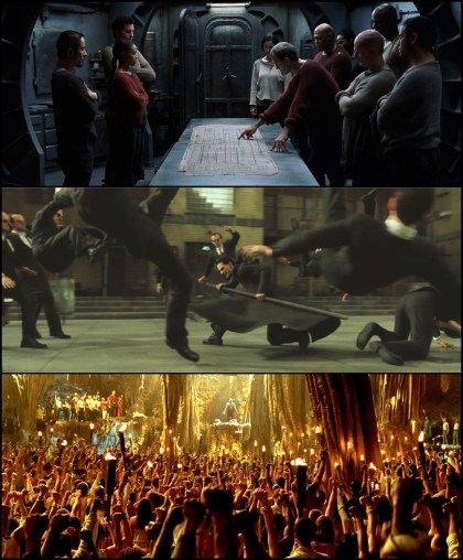 Top to bottom: A bunch of characters — most of whom we don’t care about — discuss battle strategies, a CGI Neo takes out multiple CGI Agent Smiths with a pole, and the sweaty cave-raver begins.