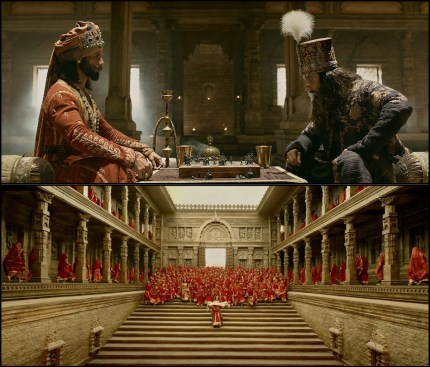 Top: Shahid Kapoor (left) challenges Ranveer Singh (right) to a symbolic chess match. Bottom: The preamble to Deepika Padukone and her maidens’ juahar, or mass self-immolation.