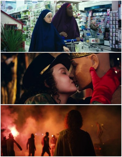 Top: Amamra and Lukumuena shoplift candy from under the cover of their conservative Muslim garb. Middle: Amamra smooches with a mannequin backstage in a public theatre. Bottom: A predictable tragedy leads to predictable public unrest and riot as Amamra’s world falls apart around her.