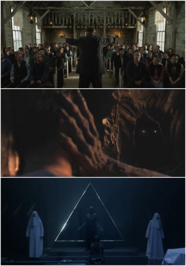 Top: Michael Sheen (center) preaches to his blasphemous pagan cult in The Apostle. Middle: A brief glimpse of the woodland monster in The Ritual. Bottom: Kenneth Walsh (center) prepares to open an inter-dimensional portal in The Void.