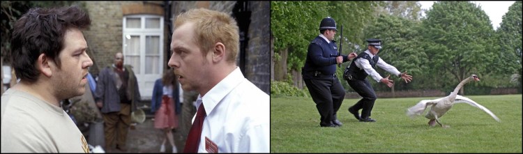 Left: In Shaun of the Dead, Simon Pegg (right) and Nick Frost (left) can’t decide what they think of their new undead antagonists. Right: In Hot Fuzz, Pegg and Frost attempt to capture a runaway swan in West Country. Hilarity ensues.