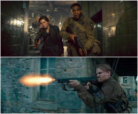 Top: Jovan Adepo (right) and Mathilde Ollivier (left) fight their way out of a secret underground Nazi lair. Bottom: Wyatt Russell (son of Kurt Russell) fires his Thompson submachine gun at an SS officer.