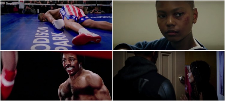 What’s just as interesting is how, prior to this exchange, Johnson got clocked by a savage right hook from defending light heavyweight “Pretty” Ricky Conlan (real-life boxer Anthony Lewis Bellew), which prompted Rocky to consider throwing in the towel. A neat flashback montage sequence intercuts with Adonis’ body crumpling to the mat in slow-motion, recalling the major events of his life witnessed in the film; these include (1) his meeting with Marry Anne in juvenile hall, (2) his rejection and reconciliation with Bianca, (3) Rocky’s cancer diagnosis and treatment, and (4) mysterious archived footage of his father boxing in the ring. After the forth hard-cut, Johnson springs from unconsciousness to his feet “like a man possessed.”
