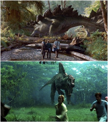 Top: The Lost World’s introduction of the stegosauruses boasts a subtlety the rest of the film lacks. Bottom: Though his design is neat, the numerous Spinosaurus set-pieces grow repetitive.