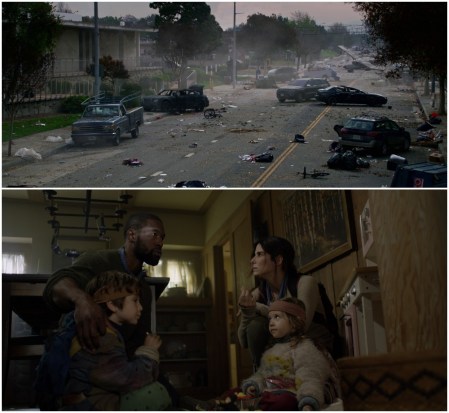 Top: Our principal cast drive an SUV with painted windows (i.e. blind) to a nearby supermarket to restock on supplies, Dawn of the Dead (1978)-style. Bottom: Trevante Rhodes (far left) debates with Sandra Bullock (far right) whether to leave their house and try for an alleged safe-house advertised on a survivor’s radio.