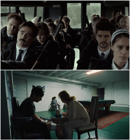 Top: Colin Farrell, John C. Reilly, Ben Wipshaw et al. prepare for their weekly “runaway singles” hunt. Everyone’s thrilled. Bottom: Nicole Kidman (foreground right) pleads with Barry Keoghan (foreground left) to spare her family.