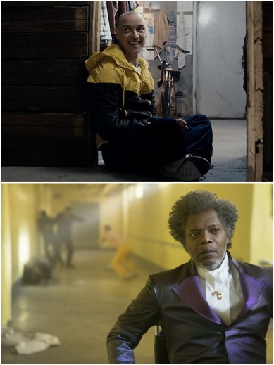 Top: He’s done awful things to people, and he’ll do awful things to you! — James McAvoy in Split Bottom: First name: Mr. Last name… Glass — Samuel L. Jackson (right) is the mastermind behind James McAvoy’s (background, center) “The Horde” in Glass.