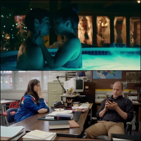 Top: How’s that for “steamy” lighting? Bottom: Aw, this is kinda sweet, I mean… oh. — Woody Harrelson (right) attempts to console a distraught Hailee Steinfeld (left).