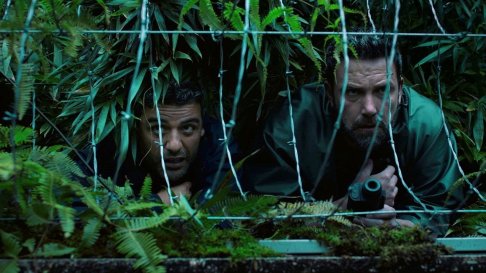 Leads Oscar Isaac (left) and Ben Affleck (right) scope out a drug lord’s estate along the border of Brazil and Colombia toward the end of the movie’s first act.