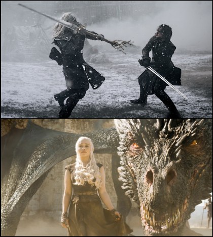 Examples of the series’ rare use of outright fantasy — Top: Jon Snow (Kit Harington, right) battles an undead White Walker. Bottom: Daenerys Targaryen (Emilia Clarke) commands her full grown dragon, illustrating her subplot’s frequent use of blocking to suggest she is a metaphorical dragon.