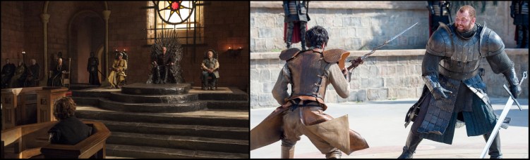 Top: A kangaroo court is held to punish Tyrion Lannister (Peter Dinklage, foreground left) for ostensibly killing the King of Westeros (Jack Gleeson). Bottom: The court results in one of the series’ best fight sequences between The Mountain, Ser Gregor Clegane (Icelandic strongman Hafbor Julius Bjornsson, right) and The Viper (Pedro Pascal, left).