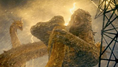 Godzilla grapples with his nemesis, the three-headed dragon King Ghidorah, in the finale of King of the Monsters, set in Boston.