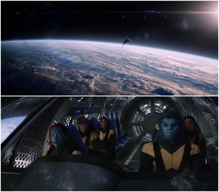 Top: Our X-Men fly their jet into near earth orbit in the film’s opening act. Bottom: Team-leaders Mystique (Jennifer Lawrence, foreground left) and Beast (Nicholas Hoult, foreground right) prepare to rescue a NASA team in distress.