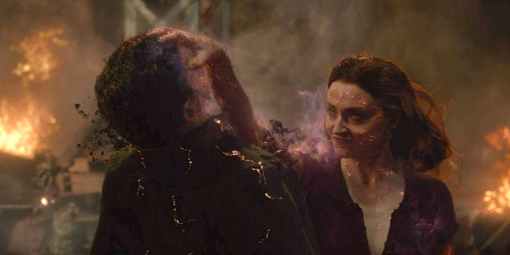 Jean Grey (Sophie Turner, right) unleashes her Dark Phoenix powers on an alien combatant.