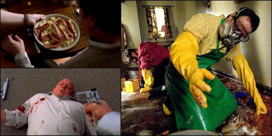 Top Left: Bryan Cranston enjoys a serving of “veggie-bacon” for his 50th birthday in the series’ pilot. Bottom Left: Fan-favorite supporting character, Dean Norris, is attacked by a cartel sicario. Es muy fácil! Right: Cranston (right) and Aaron Paul (left) clean up the remains of a corpse-disposal job gone wrong.