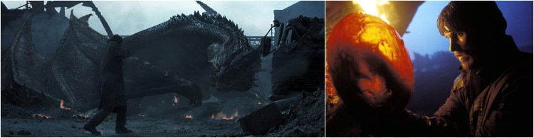 Left: Christian Bale aims at a male dragon with a crossbow armed with an explosive head. Right: Earlier in the film, Bale examines an egg pulled from the body of a dragon corpse.